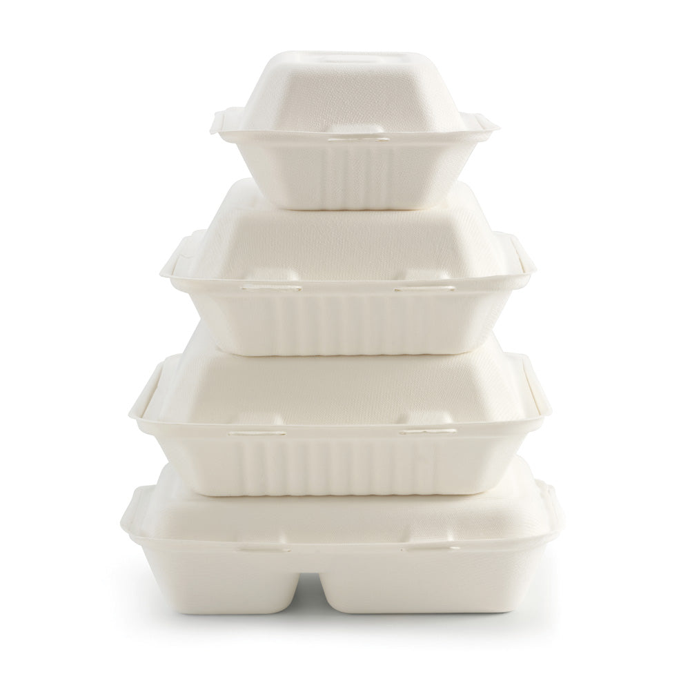 Our plastic-free clamshells are made from rapidly renewable sugarcane pulp, a by-product of the sugar refining industry. Our 7.8x8x3" white bagasse clamshell containers are an eco-friendly alternative to plastic takeaway containers.